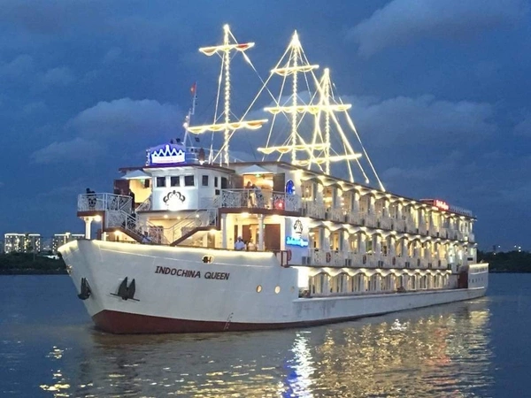 • 19h15: Khai Tiệc Buffet, Du Khách thưởng thức tiệc Buffet với trên 20 món ăn được thực hiện bởi đội ngũ đầu Bếp Indochina Queen chuyên nghiệp, kinh nghiệm lâu năm. Du Thuyền sẽ xuất bến chạy du ngoạn trên Sông Sài Gòn Về Đêm. Du khách sẽ thưởng ngoạn ngắm nhìn cảnh quan, đời sống cư dân hai bên bờ Sông Sài Gòn, cảm nhận sự khác biệt “ Trên Bến Dưới Thuyền” tại một Thành Phố hiện đại, trung tâm kinh tế của cả nước. Du Thuyền sẽ đi ngang qua các địa danh lịch sử như: Cảng Nhà Rồng ( nơi trước đây Bác Hồ ra đi tìm đường cứu nước), Bến Bạch Đằng ( Bến Ngự), cảng Khánh Hội, chạy hướng về cầu Phú Mỹ.